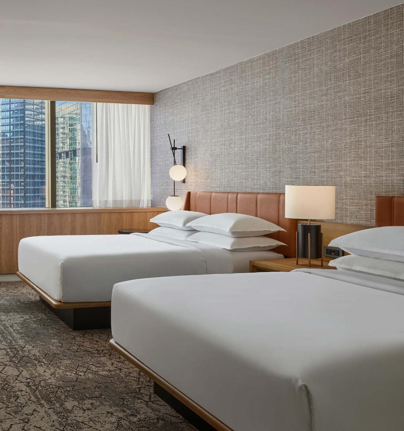 Concierge Level Two Queen Beds with City View. Offering free toiletries and bathrobes, this quadruple room includes a private bathroom with a walk-in shower and a hairdryer. The quadruple room has carpeted floors, a seating area with a flat-screen TV with cable channels, air conditioning, a tea and coffee maker, as well as executive lounge access. The unit has 2 beds. ;