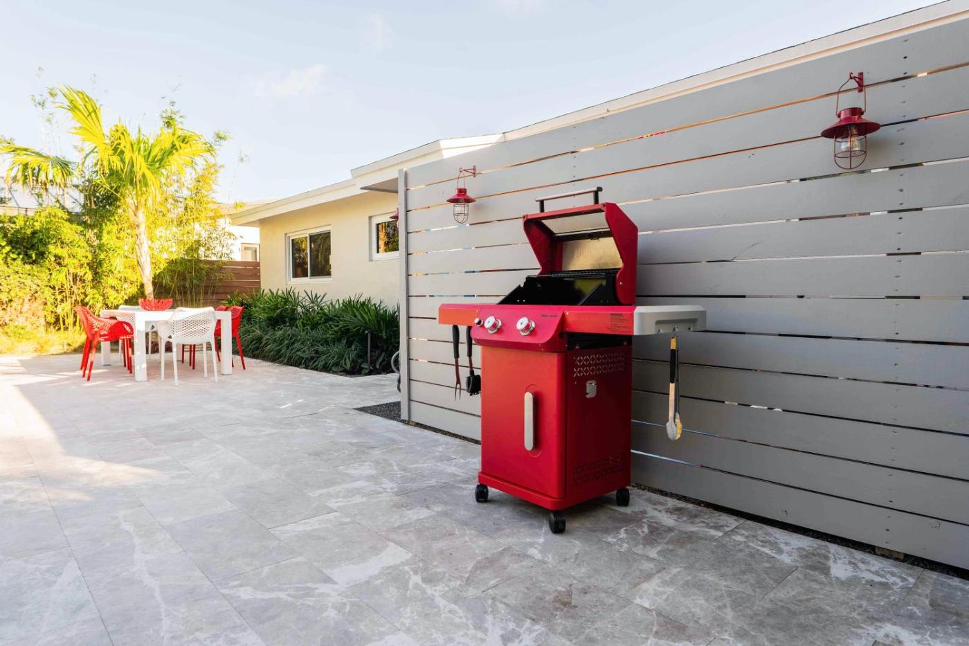 Guests can relax near the outdoor fireplace at the holiday home.