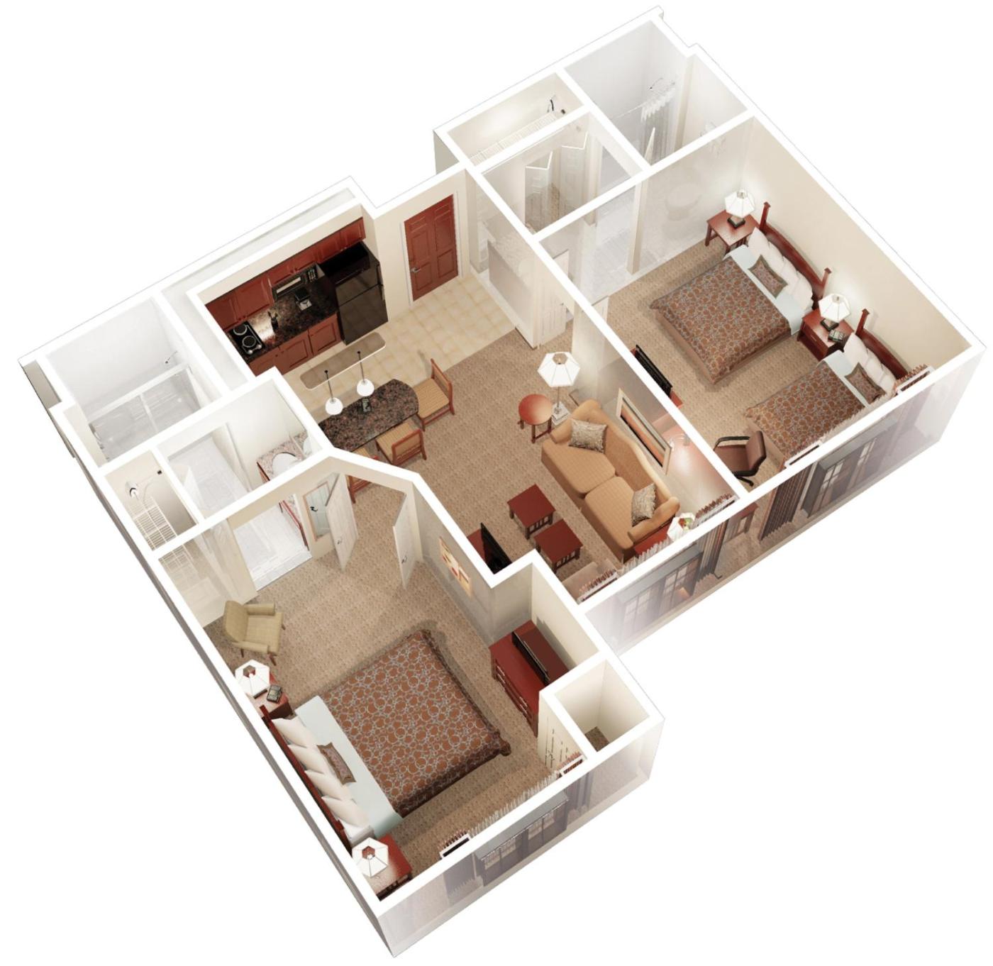 Two-Bedroom Suite. Spacious suite offers 3 TVs, 2 bathrooms and a separate living room with a dining table. ;