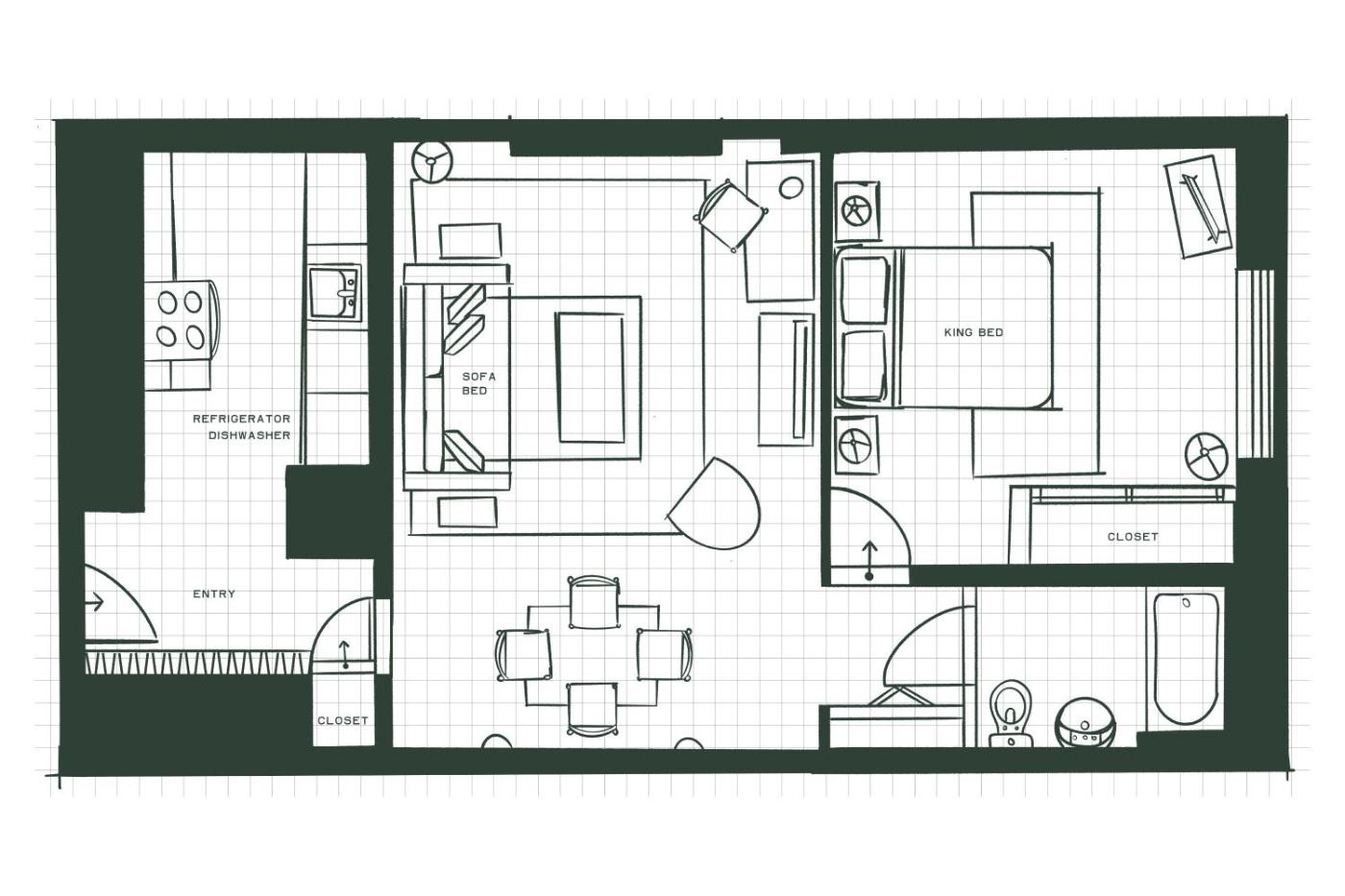 The One-Bedroom King Apartment. This suite comes with a living room that has a sofa bed and a dining area. It also has a kitchenup with appliances, a private bathroom with a shower and tub combination, a work desk with a chair and a king bedroom. It features 11 foot ceilings and hardwood floors. The bedroom has a king pillow top bed. Other amenities include an LCD TVs in the living and bedrooms, DVD player, complimentary hot breakfast, local calls, WiFi access, daily newspaper, a fridge, microwave, dishwasher, stove, oven, toaster, coffee maker, iPod player radio, in-room safe, iron, ironing board, hair dryer and toiletries. ;