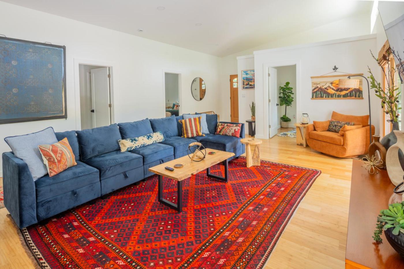 Three-Bedroom Home. This holiday home features a hot tub. Boasting a private entrance, this air-conditioned holiday home features 1 living room, 3 separate bedrooms and 2 bathrooms with a bath and a shower. Guests can make meals in the kitchen that has a stovetop, a refrigerator, a dishwasher and kitchenware. The spacious holiday home features a flat-screen TV with streaming services, a washing machine, a tea and coffee maker, a seating area as well as garden views. The unit has 5 beds.